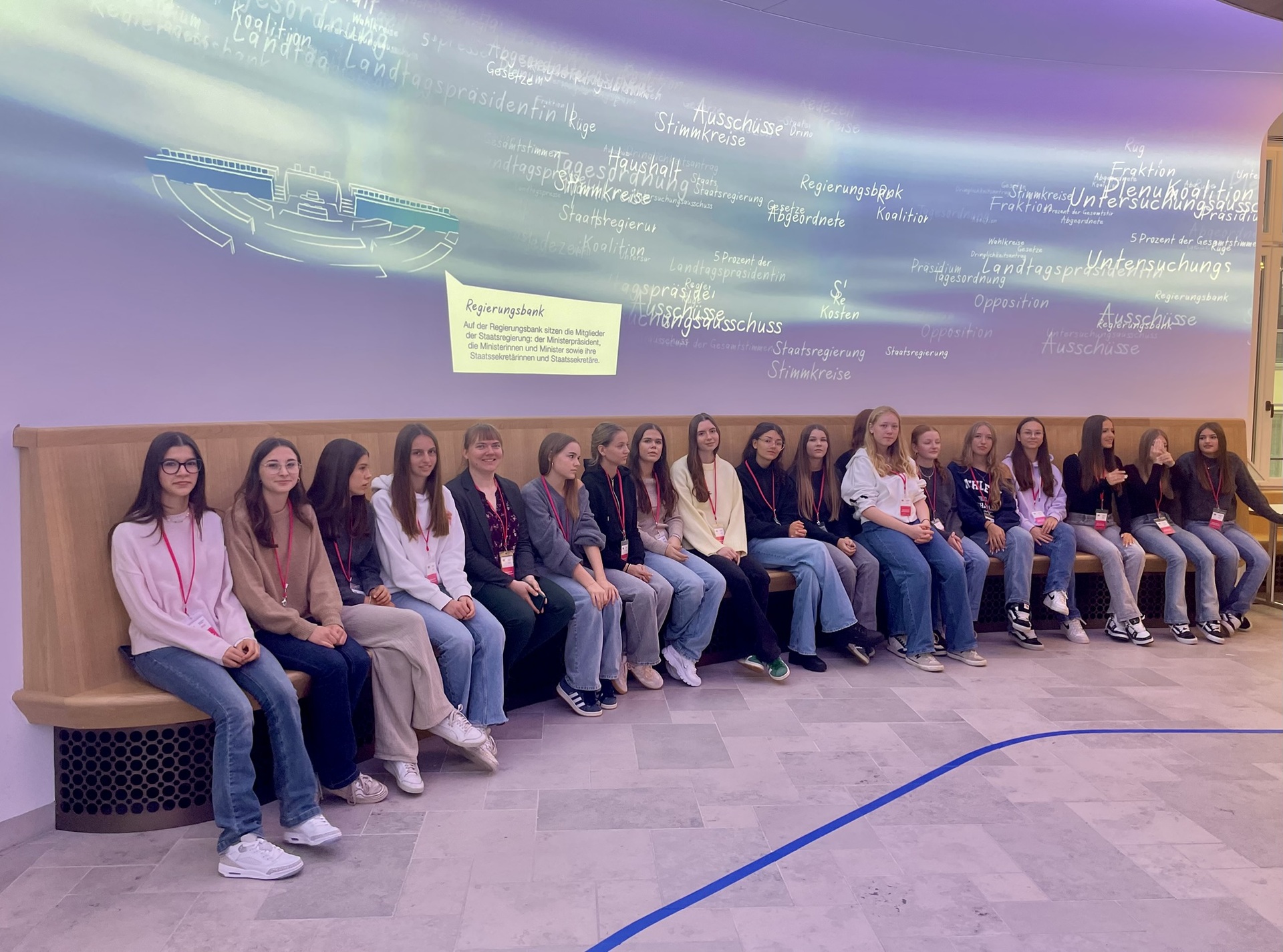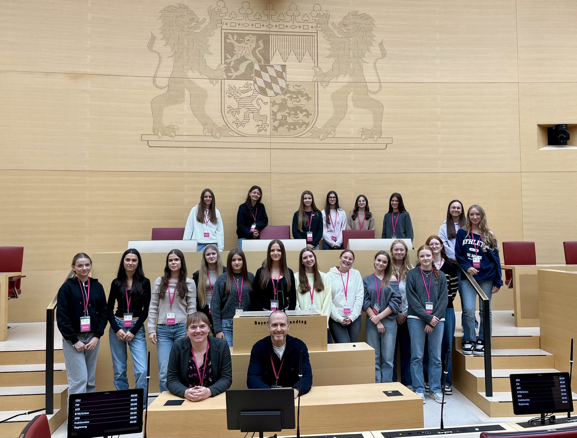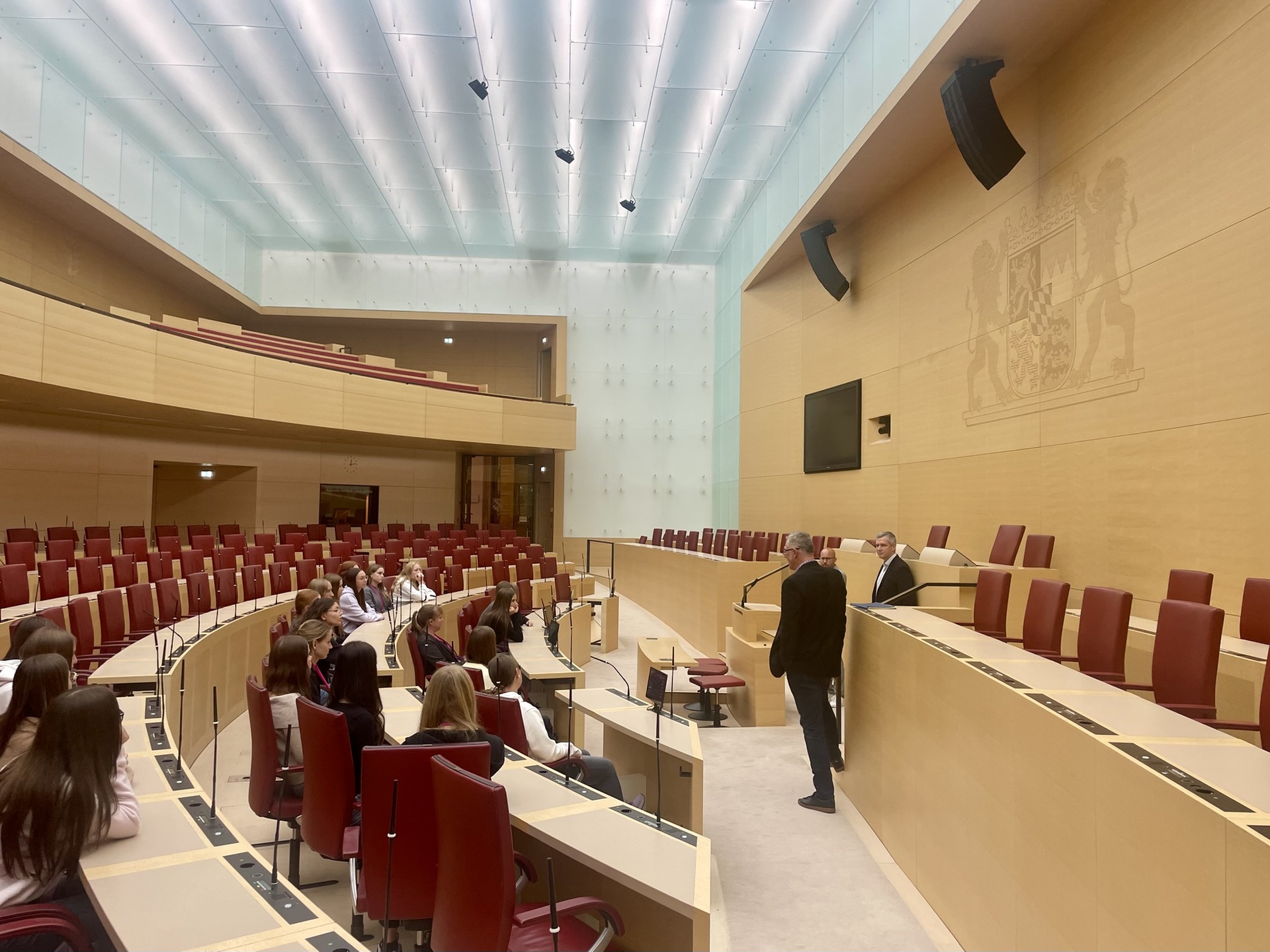 Am 24.09. durften unsere 10. Klässlerinnen mit Frau Ermer und Herrn Steger den Bayerischen Landtag im München besuchen. Nach einer kurzen Inforunde und einem Film in einem der Sitzungssäle durften wir das Maximilianeum unter Führung eines Guides genauer erkunden. Wer wusste bitte vorher, dass im Grundstein des Baus aus dem 19. Jahrhundert ein Modell des Adlers, der ersten Eisenbahn zwischen Nürnberg und Fürth, steckte?