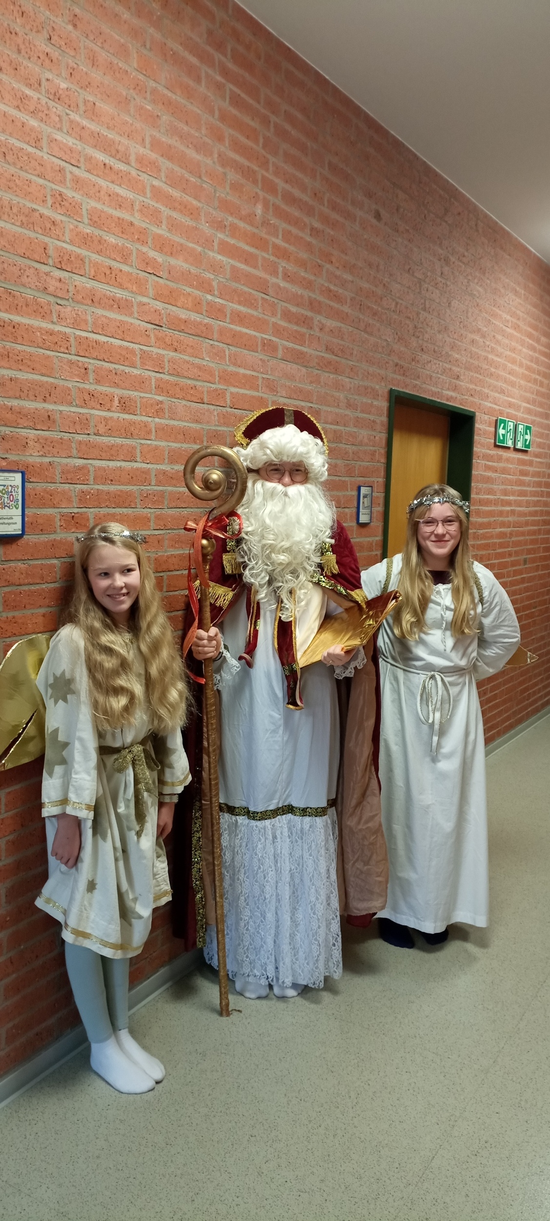 Der heilige Nikolaus, dargestellt von Elena Koch (Klasse 10) besuchte die Schule und wurde dabei von zwei Engeln (Anne Wolf und Skadi Gabbert, beide Klasse 6) begleitet. Der Empfang fand im Musiksaal statt, wo sich die Klassen versammelten. In gedichteter Form wandte sich der Nikolaus an die einzelnen Klassen, lobte positives Verhalten, Fleiß und Gemeinschaftssinn, sprach aber auch mahnende Worte, wo es nötig war – stets wohlwollend und mit einem Augenzwinkern. Gemeinsam wurden adventliche Lieder gesungen, die für eine feierliche Stimmung sorgten. Zum Abschluss durfte sich jede Schülerin über ein kleines Geschenk freuen: Süßigkeiten und Obst.